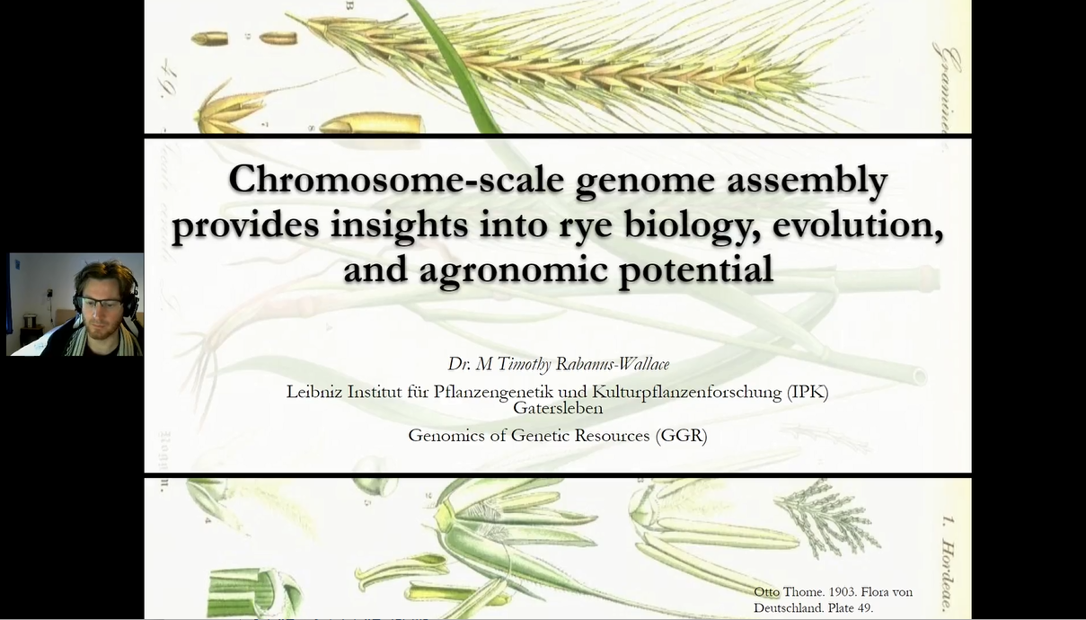 德國萊布尼茨植物遺傳與作物研究所Timothy Rabanus-Wallace 博士講述了黑麥基因組破譯所面臨的挑戰(zhàn),并細致全面的講述了本次研究聯(lián)合短讀長、Hi-C、10×Genomics、遺傳圖譜及光學(xué)圖譜等技術(shù)如何破譯歐洲栽培黑麥“Lo7”基因組。解析了黑麥基因間空間的演化,以及抗病、抗寒與自交不親和等生物學(xué)過程的發(fā)生與作用機制,揭示了黑麥易位染色體片段對小麥遺傳改良的重要作用。Timothy 博士表示,未來可以基于品種間Hi-C基因組定位,在威寧黑麥和Lo7基因組間進行系統(tǒng)的結(jié)構(gòu)比較,研究不同品系黑麥基因組間的大片段結(jié)構(gòu)變異。