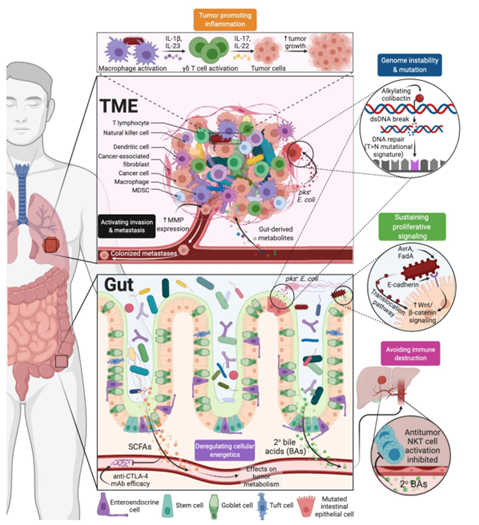腸道中存在許多的微生物,它們是宿主能量獲取的關(guān)鍵中介,并且能將膳食營養(yǎng)素代謝為許多的生物活性物質(zhì),從而作為溝通腸道菌群與宿主相互作用的橋梁。腸道菌群由宿主基因、免疫應(yīng)答及飲食因素調(diào)控,而腸道菌群的代謝和免疫潛能決定了其在宿主健康和疾病中的重要意義。研究表明,腸道微生物紊亂與多種疾病的發(fā)生密切相關(guān),比如消化系統(tǒng)疾病、內(nèi)分泌系統(tǒng)疾病、精神系統(tǒng)疾病、自身免疫性疾病以及一些感染性疾病?;谶@些影響,人們越來越關(guān)注通過微生物靶向治療癌癥和其他疾病。