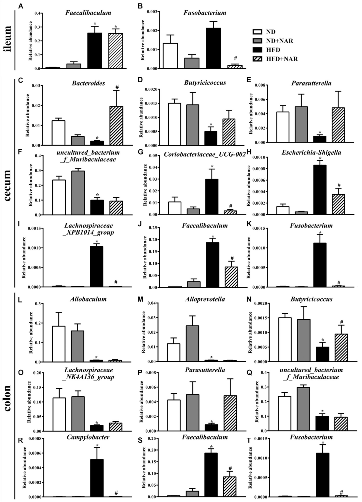 優(yōu)勢菌屬和差異菌屬熱圖顯示,補充NAR改變了HFD誘導的腸道細菌變化(圖6D-F)。與ND組相比,HFD組盲腸中Coriobacteriaceae_UCG-002、Escherichia-Shigella、Faecalibaculum、Fusobacterium、Lachnospiraceae_XPB1014_group、Parvibacter、Ruminococcaceae_UCG-005和Turicibacter相對豐度較高,Campylobacter、Dubosiella、Faecalibaculum和Fusobacterium在結(jié)腸中相對豐度較高,Bacteroides在盲腸中相對豐度較低,Butyricicoccus在結(jié)腸中相對豐度較低。NAR處理逆轉(zhuǎn)了這些效果。與ND組相比HFD飼喂小鼠腸道菌群顯示Butyricicoccus、Parasutterella和uncultured_bacterium_f_Muribaculaceae在盲腸中相對豐度較低,Allobaculum、Alloprevotella、Lachnospiraceae_NK4A136_group、Parasutterella和uncultured_bacterium_f_Muribaculaceae在結(jié)腸中相對豐度較低,F(xiàn)aecalibaculum在回腸中相對豐度較高。HFD+NAR組Bradyrhizobium、[Eubacterium]_nodatum_group、GCA-900066575、Jatrophihabitans、Massilia、Peptococcus、Sphingomonas、uncultured_bacterium_o_Acidobacteriales、uncultured_bacterium_f_Micropepsaceae和uncultured_bacterium_f_Xanthobacteraceae在盲腸中相對豐度較高,Bacteroides、Bradyrhizobium、Candidatus_Solibacter和 uncultured_bacterium_f_Xanthobacteraceae在結(jié)腸中相對豐度較高,F(xiàn)usobacterium在回腸中相對豐度較低。圖7為相對豐度改變的細菌統(tǒng)計結(jié)果,這些結(jié)果表明NAR調(diào)節(jié)了HFD小鼠腸道細菌。