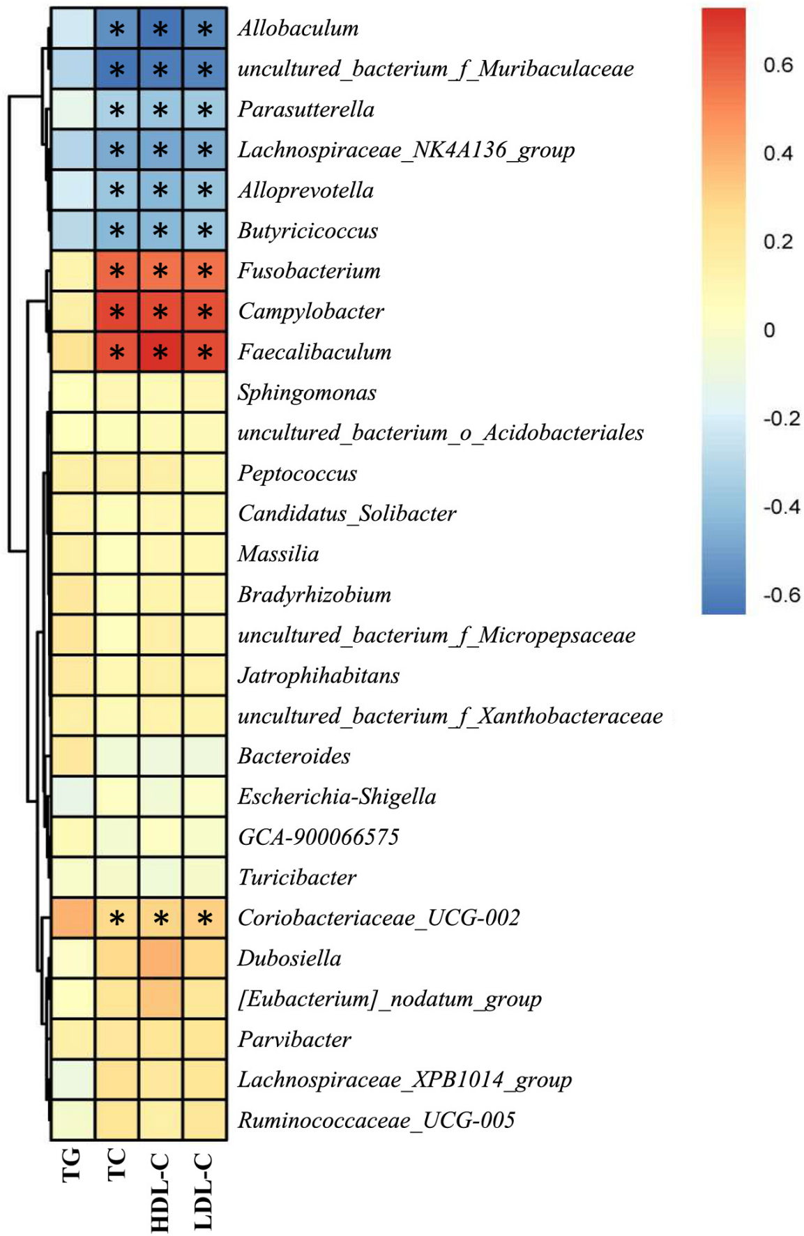 圖8 腸道細菌相對豐度與血脂水平的相關(guān)性