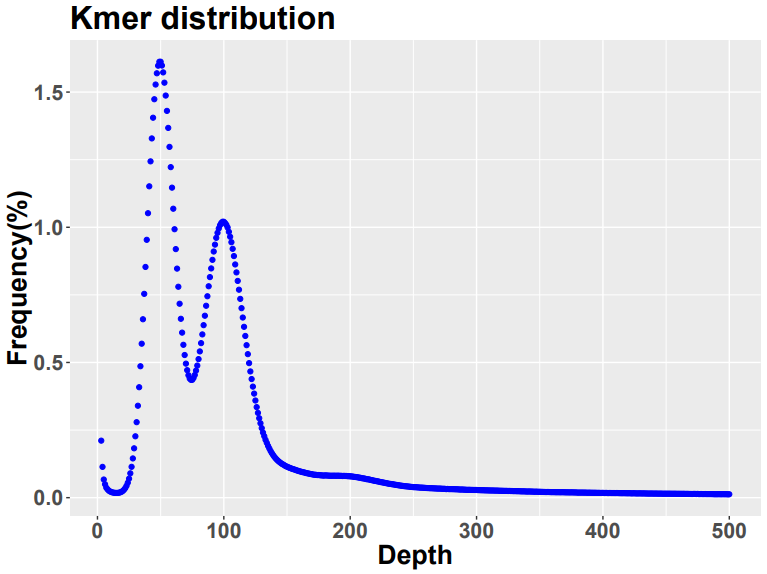 Figure 2一個二倍體的調研圖,橫軸是測序深度(覆蓋度),縱軸是k-mer出現(xiàn)的頻率,主峰位于100左右。
