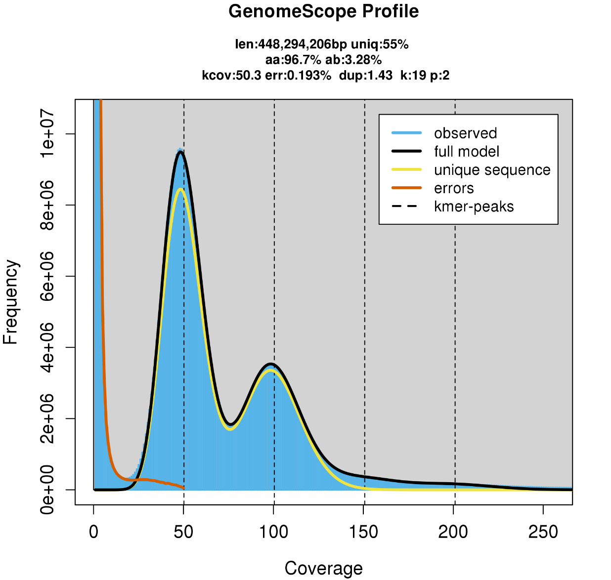 - 黃色擬合線被認為來自基因組非重復區(qū)域的K-mer分布;