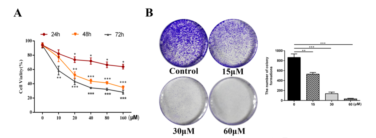 在平板克隆形成試驗(yàn)中,與未經(jīng)處理的對(duì)照組相比,經(jīng)不同濃度(15、30和60μM)的α- Cyperone處理的HeLa細(xì)胞形成的集落更少且更小,這表明α- Cyperone以劑量依賴性方式降低HeLa細(xì)胞的集落形成能力(圖1B)