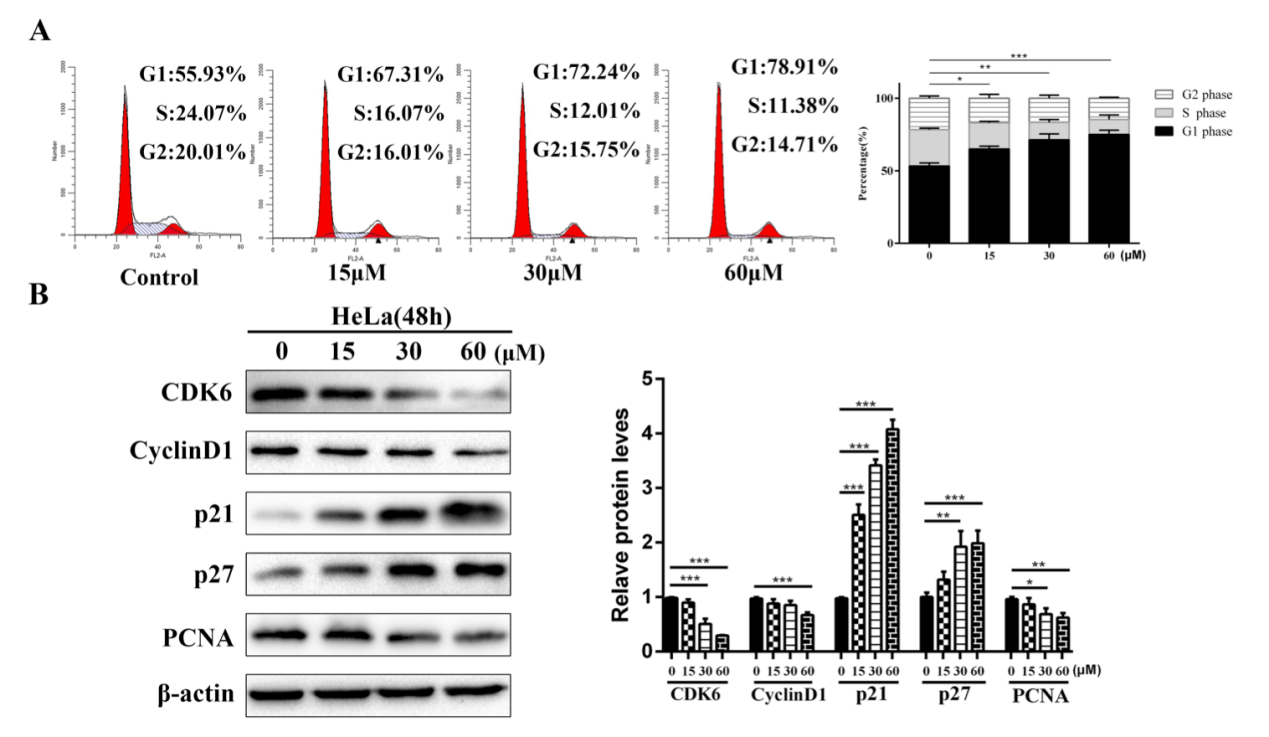 為了研究α-Cyperone是否抑制HeLa細(xì)胞的細(xì)胞周期進(jìn)程,作者用不同濃度(0、15、30和60μM)的α-Cyperone處理細(xì)胞24小時(shí),然后收集細(xì)胞進(jìn)行細(xì)胞周期分析。結(jié)果表明,α-Cyperone處理使G1期細(xì)胞百分率增加,G1期細(xì)胞百分率分別增加6.17%、15.20%和21.30%(圖2A)。采用westernblot檢測(cè)cdc25A、cyclind1、CDK6、PCNA、p21和p27的表達(dá)水平,進(jìn)一步探討α-Cyperone對(duì)G1細(xì)胞周期阻滯的作用機(jī)制。作者發(fā)現(xiàn)α-Cyperone下調(diào)cdc25A、cyclind1、CDK6和PCNA蛋白水平,同時(shí)上調(diào)p21和p27蛋白表達(dá)(圖2B)。