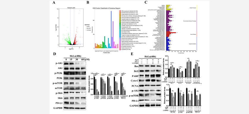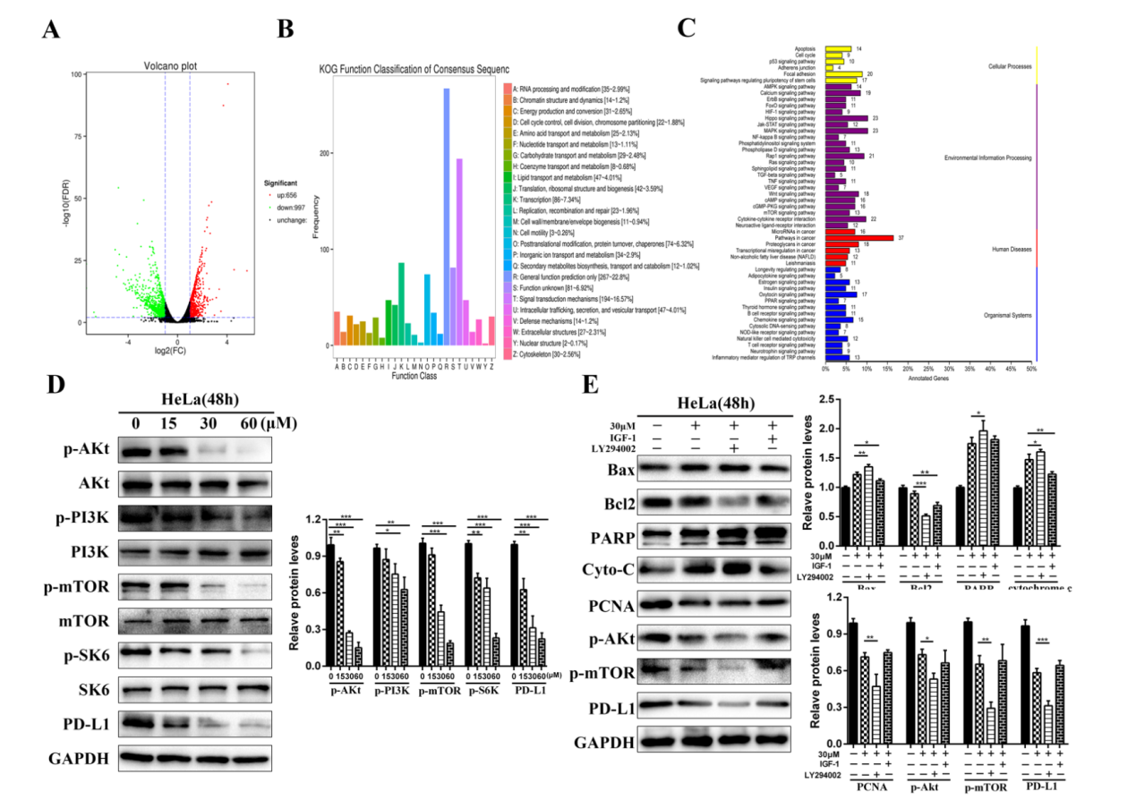 結(jié)果表明,α-Cyperone能抑制HeLa細(xì)胞的增殖并誘導(dǎo)其凋亡。從機(jī)制上講,α-Cyperone通過(guò)線粒體凋亡途徑促進(jìn)HeLa細(xì)胞凋亡,細(xì)胞內(nèi)活性氧(ROS)水平升高,細(xì)胞色素c、半胱氨酸蛋白酶-3、PARP和Bax的表達(dá)上調(diào)。進(jìn)一步的RNA測(cè)序顯示α-Cyperone抑制HeLa細(xì)胞PI3K/Akt/mTOR信號(hào)通路的激活,PI3K抑制劑和激動(dòng)劑證實(shí)了這一點(diǎn)。PI3K抑制劑(LY294002)與α-Cyperone協(xié)同抑制HeLa細(xì)胞的生長(zhǎng),而PI3K激動(dòng)劑(IGF-1)則消除了這種作用。有趣的是,α-Cyperone和LY294002均能抑制PD-L1的表達(dá),而IGF-1的補(bǔ)充則能挽救PD-L1的低表達(dá)。綜上所述,作者的研究結(jié)果揭示了α-Cyperone對(duì)HeLa細(xì)胞生長(zhǎng)的抑制作用是通過(guò)ROS介導(dǎo)的PI3K/Akt/mTOR信號(hào)通路觸發(fā)的,并且與PD-L1表達(dá)的下降密切相關(guān)。