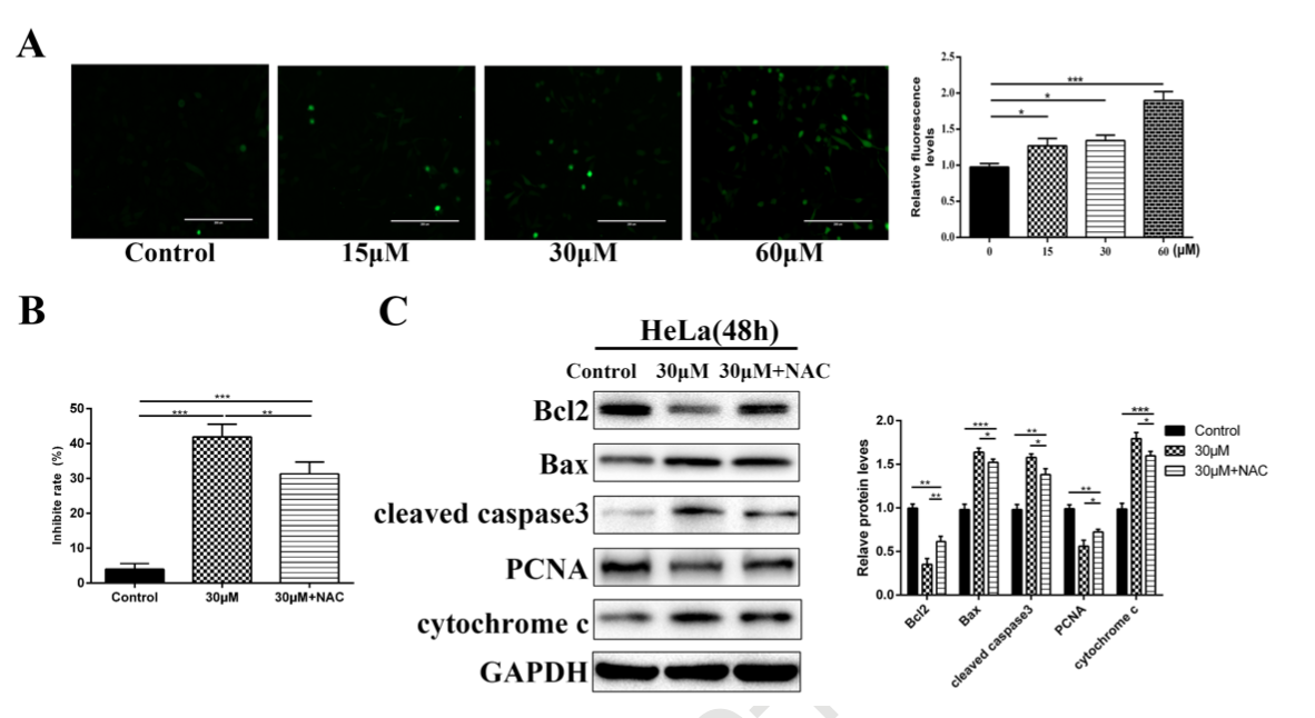 如圖4A所示,在濃度分別為15、30和60μM的α-Cyperone作用48小時(shí)后,Hela細(xì)胞產(chǎn)生的細(xì)胞ROS分別增加到30.12%、37.30%和94.67%。然后,作者進(jìn)一步確定ROS抑制劑(N-乙酰半胱氨酸,NAC)預(yù)處理是否能保護(hù)HeLa細(xì)胞免受α-Cyperone的細(xì)胞毒作用。如4B所示,與α-Cyperone單獨(dú)治療組相比,NAC和α-Cyperone聯(lián)合治療可顯著降低細(xì)胞色素c、Bax的表達(dá),增加PCNA和Bcl-2的表達(dá)。結(jié)果表明,α-Cyperone誘導(dǎo)HeLa細(xì)胞生長(zhǎng)抑制是通過(guò)破壞氧代謝平衡實(shí)現(xiàn)的。