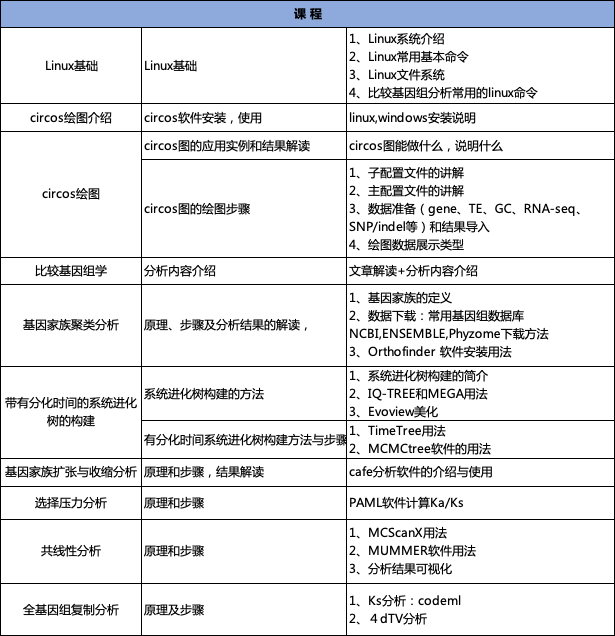 隨著測序技術(shù)的發(fā)展及測序成本的降低,越來越多的物種完成了基因組的組裝,這為多物種比較基因組學(xué)分析提供了大量的可用基因組資源。為了協(xié)助科研工作者對基因組結(jié)果進行深度挖掘,本課程將從基礎(chǔ)生信操作開始,從已發(fā)表的NG、NC等高水平文章入手,帶領(lǐng)大家學(xué)習(xí)比較基因組學(xué)常用的分析方法,從而滿足文章后期發(fā)表的需求,同時也為我們生物信息科學(xué)工作者們提供一個互相交流的平臺。