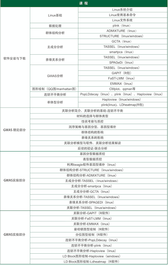 本課程主要從實踐入手,重點講解 GWAS 分析中用到的各種分析方法與常用分析軟件。包括群體結(jié)構(gòu)分析、主成分分析、親緣關(guān)系分析、連鎖不平衡分析、單體型分析等內(nèi)容。從原始數(shù)據(jù)開始,逐步完成分析內(nèi)容,并對分析內(nèi)容進行整理與挖掘,將數(shù)據(jù)轉(zhuǎn)化成更直觀的圖形來展示最終的分析結(jié)果。同時,課下還可反復(fù)觀看課程視頻,有問題隨時售后群中交流溝通,真正實現(xiàn)“線上學(xué)習(xí)理解,課后練習(xí)指導(dǎo),課下文檔復(fù)習(xí)”。