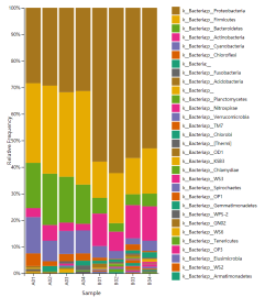 物種豐度柱狀圖:每個(gè)柱子表示一個(gè)樣品,一種顏色代表一個(gè)物種,色塊長(zhǎng)度表示物種所占相對(duì)豐度比例。通過(guò)物種分布柱狀圖即可以展示各樣品優(yōu)勢(shì)物種及組成,又可以清晰觀察到優(yōu)勢(shì)物種在不同樣品種的豐度變化趨勢(shì)。