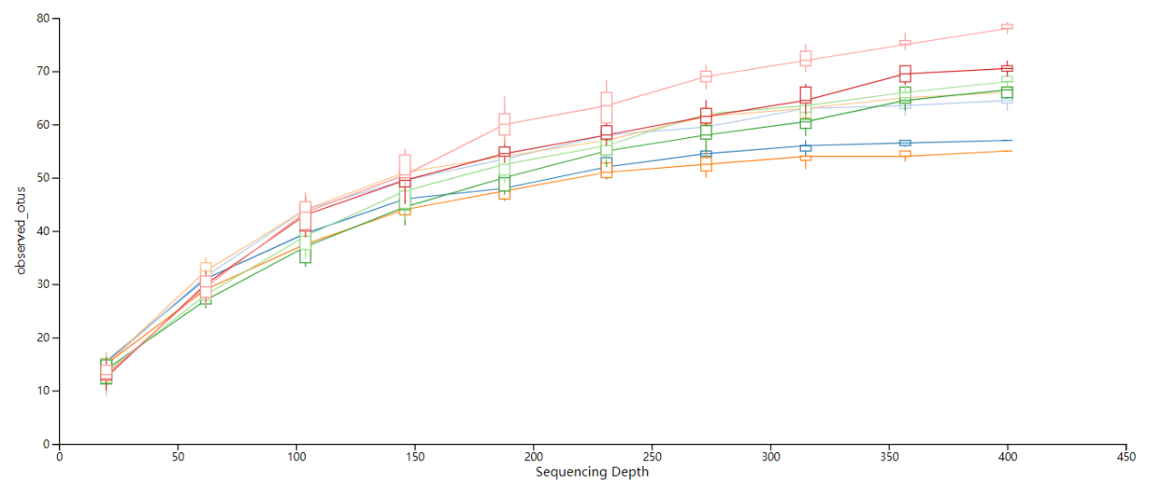 稀釋性分析:用于驗(yàn)證測(cè)序數(shù)據(jù)量是否足以反映樣品中的物種多樣性,并間接反映樣品中物種的豐富程度。在一定范圍內(nèi),隨著測(cè)序條數(shù)的加大,若曲線表現(xiàn)為急劇上升則表示群落中有大量物種被發(fā)現(xiàn);當(dāng)曲線趨于平緩,則表示此環(huán)境中的物種并不會(huì)隨測(cè)序數(shù)量的增加而顯著增多