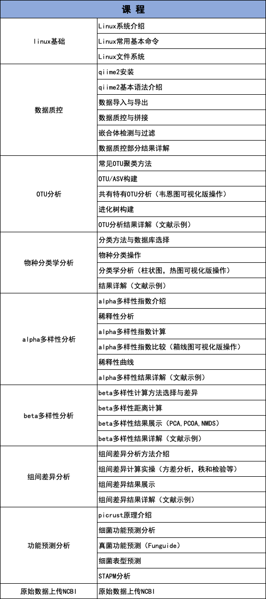 想學(xué)習(xí)如何分析微生物多樣性數(shù)據(jù)?想了解每步操作參數(shù)的意義?百邁客針對(duì)老師們對(duì)微生物多樣性內(nèi)容的需求,特開辦微生物多樣性生信課程,面向全體科研工作者,系統(tǒng)學(xué)習(xí)微生物多樣性分析中常規(guī)內(nèi)容與分析過(guò)程。課程設(shè)計(jì)覆蓋linux基本操作、QIIME2數(shù)據(jù)分析、百邁客云分析三部分內(nèi)容。
