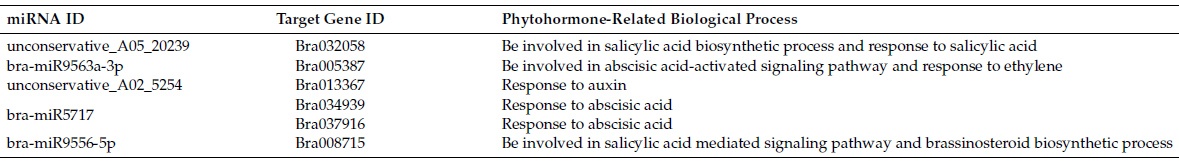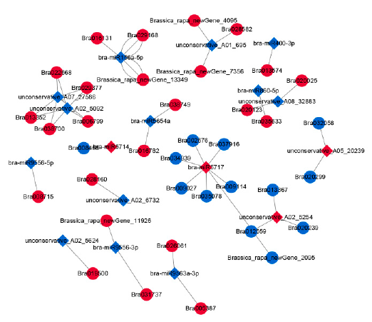 作者使用了TargetFinder來預測miRNA的靶基因,結合差異分析的結果最終得到170對miRNA和基因的調控關系,包含了18個miRNA和37個基因。對這些基因進行GO富集分析,發(fā)現(xiàn)主要是細胞過程、代謝過程等功能。對構建的網絡進行研究發(fā)現(xiàn)miRNA所調控的基因主要是涉及糖代謝、脂質代謝、花粉管生長等,同時也發(fā)現(xiàn)這些miRNA與植物激素相關,比如bra-miR9556-5p可能通過靶向Bra008715來參與水楊酸介導的信號通路和油菜素類固醇生物合成過程途徑。