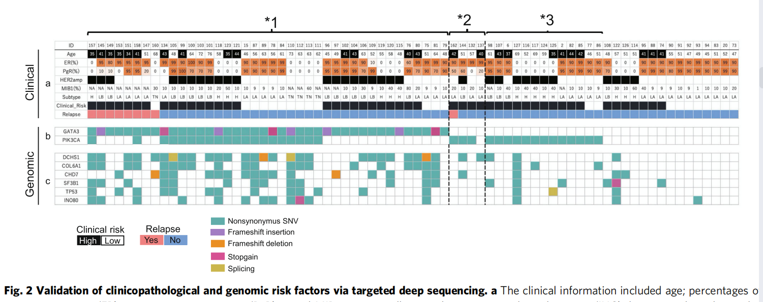 為了確定所識別的高危標(biāo)記物的分子病因,調(diào)查了另外三名具有代表性的新鮮冰凍標(biāo)本患者?;颊逜患有帶有GATA3突變(圖2,*1)和微侵襲的DCIS,病變被認(rèn)為是真正的DCIS?;颊連患有PgR低表達(dá)的DCIS(圖2,*2)和微侵襲,病變被視為真正的DCIS?;颊逤患有PIK3CA突變的DCIS(圖2,*3),沒有任何微侵襲,病變被認(rèn)為可能是假DCIS(低風(fēng)險DCIS)。