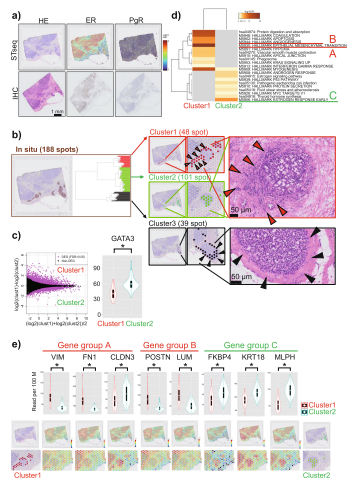 Visium分析發(fā)現(xiàn)了異質(zhì)基因表達(dá),這取決于癌區(qū)和非癌區(qū)細(xì)胞的位置。PgR表達(dá)下調(diào),盡管觀察到高ER表達(dá)(圖4a,上圖),與免疫染色結(jié)果一致(圖4a,下圖)。針對DCIS細(xì)胞中基因表達(dá)的變化,手動選擇了188個位于導(dǎo)管內(nèi)區(qū)域的形態(tài)學(xué)斑點。這些斑點的無監(jiān)督分層聚類確定了三個明顯的聚類(圖4b,左面板)。在空間上,不同的簇對應(yīng)于不同的區(qū)域(圖4b,中間面板)。重要的是,簇1的48個斑點(紅色)與DCIS細(xì)胞的位置重疊,DCIS細(xì)胞根據(jù)其形態(tài)即將入侵(由圖4b右面板中的紅色箭頭指示)。同時,簇2(有色綠色)的101個斑點位于同一導(dǎo)管的中心,并被視為不侵入基質(zhì)的細(xì)胞(由圖4B的中間板中的綠色斑點指示)。簇1和簇2之間的差異表達(dá)分析確定了2747個DEG(FDR<0.05,圖4c,左)。有趣的是,GATA3表達(dá)在簇1中顯著下調(diào)(圖4c,右圖)。盡管該基因未發(fā)生突變,但該患者的GATA3功能異??赡馨l(fā)生在基因水平。根據(jù)基因富集和通路分析的結(jié)果,該患者始終觀察到以GATA3為中心的基因表達(dá)變化,如患者A所觀察到的(圖4d,e)。共有21條途徑和18個癌癥特征,包括EMT和血管生成途徑受到影響。如對患者A所觀察到的,在未侵入間質(zhì)的第2組中,DEG主要代表雌激素反應(yīng)相關(guān)基因。總之,在這名患者身上,我們得出結(jié)論,GATA3通過其表達(dá)的變化發(fā)揮關(guān)鍵作用。即使沒有基因組突變,GATA3的異常表達(dá)也可能在某些患者中導(dǎo)致相同的結(jié)果。