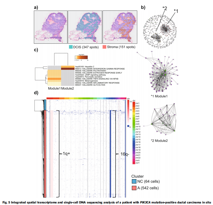 首先,利用空間轉(zhuǎn)錄組學(xué)技術(shù)——10X基因組學(xué)Visium平臺,通過STseq分析了患者A標(biāo)本的空間基因表達(dá)。該患者在術(shù)前病理診斷中被診斷為DCIS,但在術(shù)后病理診斷中發(fā)現(xiàn)有微侵襲部位。因此,DCIS病變被確定為IDC的真正前兆。平均深度為×2391.4的面板測序分析顯示該樣本含有GATA3突變(外顯子4:c.865dupG:p。C288fs,變異等位基因頻率[VAF]=7%)。在較高的VAF(外顯子5:c.T1035A:p。N345K,VAF=26.1%),表明新出現(xiàn)的GATA3突變用PIK3CA突變覆蓋了DCIS的基本特征。