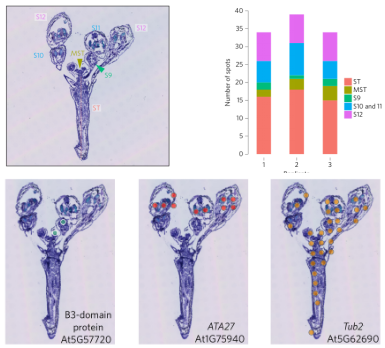 擬南芥花苞中空間轉(zhuǎn)錄組檢測(cè)莖、分生組織、以及3個(gè)不同花區(qū)域空間基因表達(dá),一共檢測(cè)到20215個(gè)基因,鑒定開(kāi)花有關(guān)的兩個(gè)關(guān)鍵基因At5g57720(已知的在S3和S9表達(dá)的基因)和 ATA27 (At1g75940,已知的在S11和S12表達(dá)的基因)的√確的空間定位可視化,組織區(qū)域特異性基因和通路的顯著差異,發(fā)現(xiàn)雄蕊絲發(fā)育通路在S11(雄蕊絲伸長(zhǎng)的位置)和莖中富集,在莖中維管通道大量存在,并且細(xì)胞伸長(zhǎng)和維管發(fā)育過(guò)程非常活躍。其中花粉外壁形成途徑在S10和S11發(fā)生改變,在這個(gè)階段,外壁是花粉壁的主要組成部分之一,在絨氈層產(chǎn)生并沉積在花粉前細(xì)胞上。空間基因表達(dá)特征揭示了組織區(qū)域異質(zhì)性,并為植物生長(zhǎng)發(fā)育過(guò)程和相應(yīng)功能的探索提供了高分辨率的空間植物基因表達(dá)模式,從新的維度探索植物發(fā)育過(guò)程。