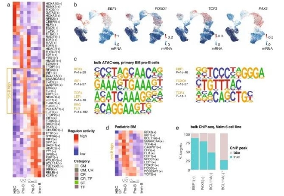 作為獨(dú)立驗(yàn)證,首先從pro-B細(xì)胞中檢索了大量ATAC-seq數(shù)據(jù),顯著富集的TF motif證實(shí)了與pro-B G1期細(xì)胞相關(guān)的9個(gè)TF(EBF1、FOXO1、TCF3、RFX5、IRF1、TCF4、LEF1、ERG、FLI1)(圖 2c)。pro-B活性TF在兒童BM數(shù)據(jù)集中也具有高度相似的活性譜(圖 2d)。接下來,分析了包括TF與目標(biāo)基因表達(dá)相關(guān)性,以及每個(gè)目標(biāo)基因位點(diǎn)的TF motif。根據(jù)發(fā)現(xiàn)集中找到的TF,在訓(xùn)練/測(cè)試集中預(yù)測(cè)它們的靶基因。為了測(cè)試預(yù)測(cè)的靶基因是否受TF調(diào)控,本研究檢索了PAX5、EBF1和BCL11A的ChIP-seq數(shù)據(jù),這些數(shù)據(jù)在人類細(xì)胞系模型 Nalm-6中可用,使用GREA T獲得與基因關(guān)聯(lián)的peak。對(duì)于PAX5和EBF1,超過75%的預(yù)測(cè)目標(biāo)具有ChIP-seq peak關(guān)聯(lián)(圖 2e)。ATAC-seq motif富集與基于ChIP-seq的TF靶基因位點(diǎn)驗(yàn)證,結(jié)果高度一致,證明TF活性評(píng)分反映了調(diào)節(jié)作用。說明本研究對(duì)健康人BM單細(xì)胞轉(zhuǎn)錄組的分析為基因表達(dá)和TF活性變化提供了全面的參考,這些變化表征了單細(xì)胞分辨率下早期B細(xì)胞譜系分化的特征。