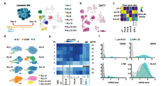 為了表征ALL(E/R)中常見的TF融合的白血病細(xì)胞,本研究對(duì)6個(gè)兒童E/R+ pre-B-ALL病例進(jìn)行了scRNA-seq,收集6個(gè)診斷期和2個(gè)誘導(dǎo)化療第15天的BM樣本(圖 3a)?;贒NTT表達(dá)及其與正常BM細(xì)胞類型的明確分離,確定了每個(gè)供體中的白血病細(xì)胞簇(圖 3b)。基于B細(xì)胞譜系簇特異性基因集,發(fā)現(xiàn)診斷時(shí)白血病母細(xì)胞類似于pro-B分化狀態(tài)(圖 3c)。該分析同樣將pro-B細(xì)胞鑒定為*接近的正常分化狀態(tài),這與之前的研究一致。細(xì)胞周期狀態(tài)在不同情況下不同,ALL3中的循環(huán)細(xì)胞比例*低,ALL9中的*高比例(圖 3d)。對(duì)于具有中期誘導(dǎo)治療的2個(gè)病例(ALL10 和 ALL12),在第15天收集的樣本中細(xì)胞分離為不同的細(xì)胞狀態(tài)(圖 3a、d),表明治療進(jìn)一步改變了白血病細(xì)胞狀態(tài)。