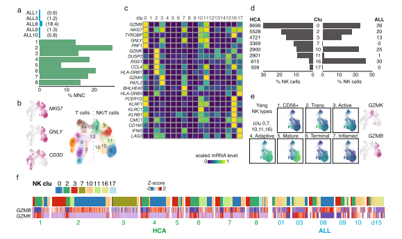 為了進(jìn)一步表征免疫細(xì)胞群,將HCA和E/R+ ALL供體的T細(xì)胞和NK細(xì)胞匯集在一起進(jìn)行聯(lián)合分析。基于聚類和marker基因分析,可以區(qū)分幾種不同的NK細(xì)胞類型(圖 4b、c)。篩選表達(dá)GNLY或NKG7的cluster(cluster 0、2、3、7、10、11、16),發(fā)現(xiàn)與來自HCA供體的NK細(xì)胞相比,來自ALL BM的NK細(xì)胞被隨機(jī)分配給這些cluster(圖 4d)。具體來說,所有NK細(xì)胞主要代表cluster 10和16,它們與表達(dá)未成熟CD56bright 和過渡NK細(xì)胞的顆粒酶 K(GZMK)相匹配(圖 4e 中的基因組評(píng)分代表來自scRNA-seq研究的NK亞型)。相比之下,大多數(shù)正常 BM NK細(xì)胞代表表達(dá)顆粒酶 B(GZMB)和穿孔素(PRF1)的成熟或終末NK細(xì)胞(cluster 0)。因此,E/R+白血病細(xì)胞可能會(huì)主動(dòng)逃避NK細(xì)胞的細(xì)胞毒性,然而,NK類型的頻率因供體而異(圖 4f)。高表達(dá)IFNG的cluster 7幾乎完全對(duì)應(yīng)于HCA供體 3,而與其他ALL病例相比,細(xì)胞周期高度活躍的ALL8和ALL9更類似于正常BM中的成熟或活性NK細(xì)胞譜??傊?,白血病細(xì)胞狀態(tài)與正常pro-B分化狀態(tài)的不同之處在于干/祖細(xì)胞特異性基因和幾種免疫調(diào)節(jié)基因的高表達(dá)。免疫調(diào)節(jié)基因的變化反映為E/R+ BM內(nèi)更多不成熟的NK細(xì)胞類型。
