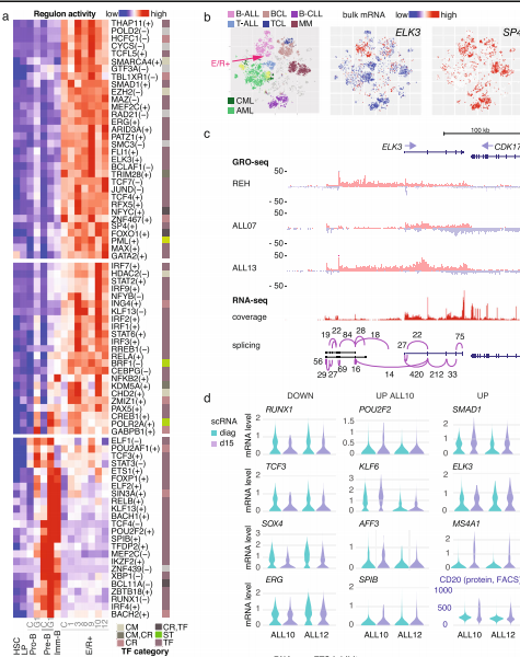 基于bulk RNA分析可以驗(yàn)證它們?cè)贐-ALL中的表達(dá),在E/R+亞型(紅色箭頭)中檢測(cè)到的比例*高,如在t-SNE圖上比較血液系統(tǒng)惡性腫瘤所示(圖 5b),其中惡性淋巴瘤在圖上突出顯示。兩種常見的B-ALL亞型(E/R+和高超二倍體病例)顯示出類似的高ELK3,而升高的SP4則更具 E/R 特異性,進(jìn)一步分析了E/R+細(xì)胞中的這些TF基因座(圖 5c)。本研究使用GRO-seq對(duì)E/R+ BM中的新生轉(zhuǎn)錄進(jìn)行了分析,揭示了Pol2參與編碼和非編碼區(qū)的主動(dòng)起始和延伸。GRO-seq 證實(shí)了這些基因位點(diǎn)在 E/R+細(xì)胞中的轉(zhuǎn)錄活性(圖 5c)。此外,還揭示了ELK3上游未注釋(Refseq、UCSC 或 Gencode)的轉(zhuǎn)錄起始位點(diǎn)(TSS)(圖 5c)。兩個(gè)lncRNA庫在該基因組區(qū)域內(nèi)具有匹配的轉(zhuǎn)錄本,但注釋之間的一致性很差。因此,在E/R+ BM(n = 8,scRNA-seq 和 GRO-seq 分析中的匹配樣本)中使用配對(duì)的bulk RNA-seq 進(jìn)一步檢測(cè)了該基因座內(nèi)的剪接模式。帶注釋的ELK3轉(zhuǎn)錄本具有來自剪接點(diǎn)跨越reads的支持,而上游轉(zhuǎn)錄本與lncRNA結(jié)構(gòu)*匹配(圖 5c)。