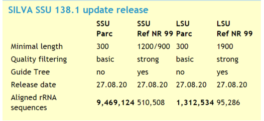 SILVA是一個(gè)包含三域微生物(細(xì)菌、古菌、真核)rRNA基因序列的綜合數(shù)據(jù)庫(kù),其數(shù)據(jù)庫(kù)涵蓋了原核和真核微生物的小亞基rRNA基因序列(簡(jiǎn)稱(chēng)SSU,即16S和18SrRNA)和大亞基rRNA基因序列(簡(jiǎn)稱(chēng)LSU,即23S和28SrRNA)。目前數(shù)據(jù)庫(kù)版本為SILVA 138.1,更新時(shí)間為2020年9月2日,數(shù)據(jù)庫(kù)包含的數(shù)據(jù)信息見(jiàn)下表1所示。