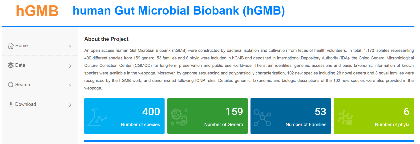 2021年5月,中科院微生物所通過(guò)從健康志愿者糞便中分離培養(yǎng)細(xì)菌,構(gòu)建了一個(gè)開(kāi)放獲取的人類(lèi)腸道微生物庫(kù)(hGMB)。數(shù)據(jù)庫(kù)共有1170個(gè)菌株,代表6門(mén)53科159屬400個(gè)不同物種。并保存在國(guó)際保存機(jī)構(gòu)(IDA)-中國(guó)微生物培養(yǎng)總收集中心(CGMCC),以便在全球范圍內(nèi)長(zhǎng)期保存和公共使用。該網(wǎng)站提供了已知物種的菌株身份、基因組材料和基本分類(lèi)信息。根據(jù)國(guó)際原核生物命名規(guī)則,對(duì)102個(gè)新種進(jìn)行了特征描述和命名,提出了28個(gè)新屬和3個(gè)新科。hGMB代表了全球人類(lèi)腸道16S rRNA基因擴(kuò)增子數(shù)據(jù)(n=11647)中80%以上的常見(jiàn)和優(yōu)勢(shì)人類(lèi)腸道微生物屬和種。