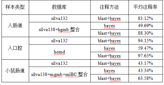 ? ? ? ? 結(jié)果表明,其中物種注釋方法方面:blast+bayes方法優(yōu)于bayes,平均提升30%注釋率提升:采用blast+bayes,silva132數(shù)據(jù)庫(kù)比較,平均提升9.7%,其中人腸道提升5.18%,口腔提升3.5%,小鼠腸道提升20.41%。其中人腸道樣本使用silva138+hgmb整合數(shù)據(jù)庫(kù)種水平注釋結(jié)果,人口腔樣本使用homd數(shù)據(jù)庫(kù)種水平注釋結(jié)果,小鼠腸道選擇silva138+mgmb+miBC整合數(shù)據(jù)庫(kù)。