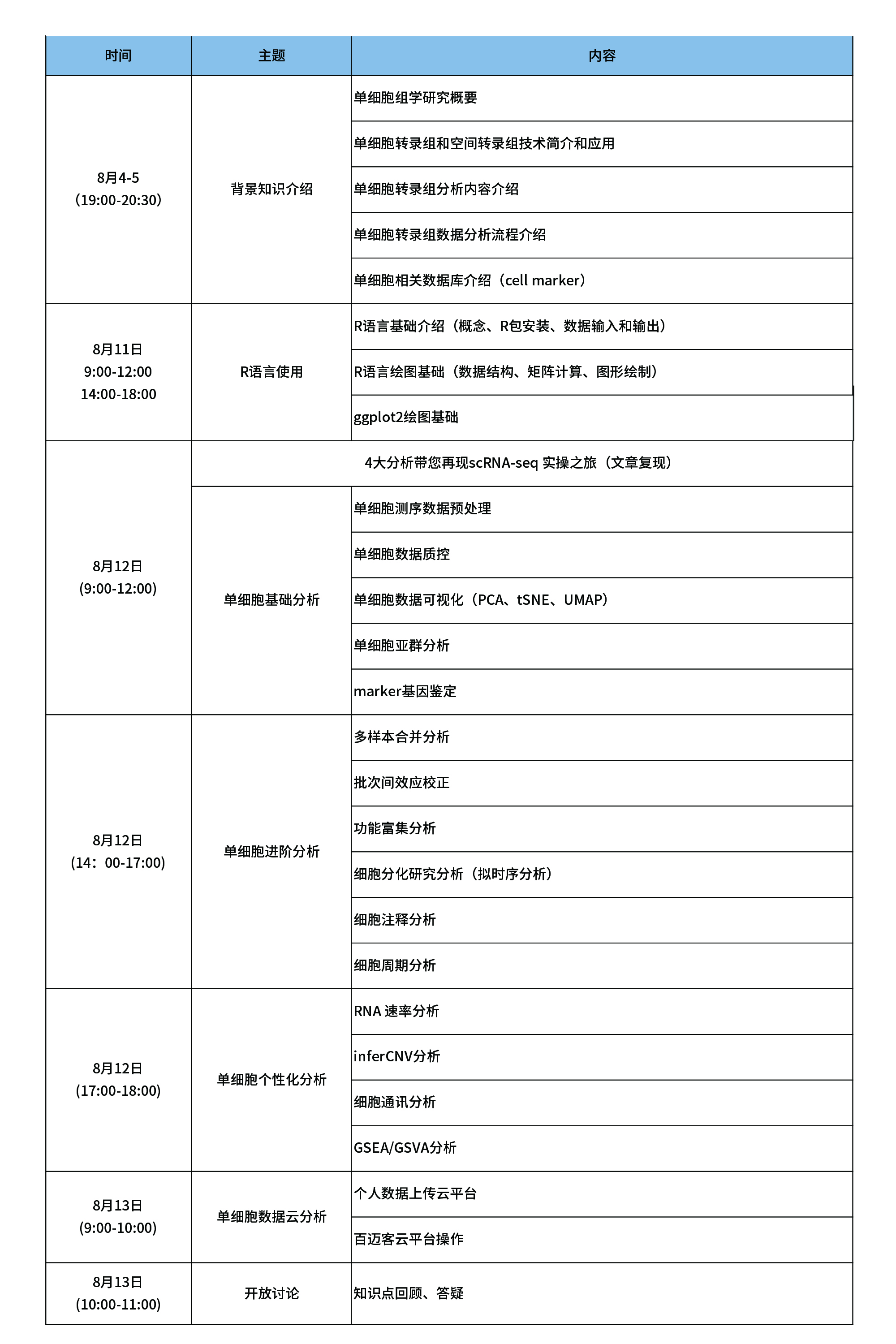 細(xì)胞和空間組學(xué)技術(shù)的快速發(fā)展正在開啟生命科學(xué)的時(shí)空多維新時(shí)代,為復(fù)雜疾病的細(xì)胞異質(zhì)性研究提供新視角,引領(lǐng)了生物學(xué)從“時(shí)間”維度走向“空間”維度,廣泛應(yīng)用于動(dòng)植物生長發(fā)育、腫瘤精準(zhǔn)治療研究等方向。為了促進(jìn)單細(xì)胞數(shù)據(jù)挖掘和分析,百邁客特開展的單細(xì)胞數(shù)據(jù)分析課程,將為您呈現(xiàn)細(xì)胞分群、細(xì)胞分化研究、marker基因鑒定等分析內(nèi)容,幫助研究者實(shí)現(xiàn)了單細(xì)胞數(shù)據(jù)更快、更準(zhǔn)、更高的分析轉(zhuǎn)化。