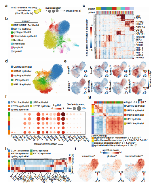 為了實現(xiàn)表征腫瘤內(nèi)異質(zhì)性的第一個目標,作者首先基于sn-RNAseq細胞類型比例研究了MIBC腫瘤的總體細胞組成(圖1a)。腫瘤由約90%的上皮細胞、5%的免疫細胞、3%的成纖維細胞和2%的內(nèi)皮細胞組成,這些細胞根據(jù)相應的角蛋白、PTPRC、膠原蛋白、PECAM1、VWF等關(guān)鍵標記基因(圖1b)。上皮間室無監(jiān)督聚類識別到了一個KRT13和KRT17差異表達的類群,KRT13、uroplakins(UPK)、KRT6A細胞周期相關(guān)基因類群,以及表達CDH12和其他上皮標記物的細胞群(圖1d)。KRT13和UPK人群是僅有的兩個缺乏來自免疫浸潤MIBC的基因標記的人群,這表明在這些人群中富集的腫瘤代表免疫“冷”腫瘤(圖1e)。進一步交叉參照傳統(tǒng)的尿上皮分化相關(guān)標記表明,KRT13和UPK群體代表一個更分化的表型,而CDH12、KRT6A和cycle群體代表一個未分化或去分化的表型(圖1f)。如預期一樣KRT13和UPK群體表達了一個上皮細胞分化網(wǎng)絡(圖1g)?;趩渭毎{(diào)控網(wǎng)絡推斷和聚類分析,預測CDH12群體表現(xiàn)出多種發(fā)育相關(guān)轉(zhuǎn)錄因子的高活性,包括NANOG、EOMES、PAX1和HOXD9(圖1h)。CDH12和循環(huán)群體在干-樣和神經(jīng)內(nèi)分泌基因標簽得分也高(圖1i)。