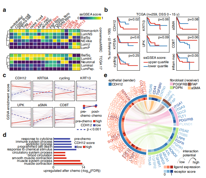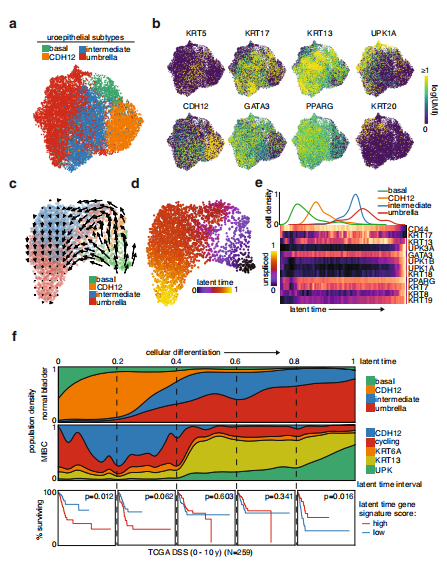 上皮細胞的無監(jiān)督聚類分為基礎、過渡和傘部類群(圖2a)。有趣的是CDH12群體與后一類典型群體明顯不同,而過渡群體的KRT13和KRT17表達水平最高(圖2b)。確定了一個始于基礎細胞的軌跡,隨后分化為兩種途徑:一種貫穿CDH12群體,一種跳過CDH12群體(圖2c和d)。關(guān)鍵的尿上皮分化標記物沿著這條路徑跟蹤,在起始階段CD44高表達,隨后中間是KRT13和KRT17,終點站為UPK1A、GATA3、PPARG(圖2e)。所有4個正常樣本的擬時序分析顯示出相似的路徑,CDH12群位于起始點附近(圖2f)。為了確定CDH12腫瘤細胞與正常腫瘤細胞之間的轉(zhuǎn)錄相似性,并推斷它們在正常上皮細胞分化軌跡上的位置,作者使用表達相似性,確定了每個MIBC上皮細胞中最接近的正常細胞,然后給腫瘤細胞分配相應的正常潛伏期(圖2f)。值得注意的是,最未分化表型對應的間隔得分預測了較差的疾病特異性生存(DSS),而最分化表型對應的間隔得分預測了較好的DSS,中間的間隔得分顯示了相反結(jié)果之間的過渡(圖2f)。