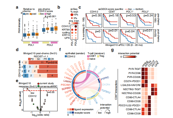 為了驗證CDH12上皮細胞引起T細胞假說,作者使用Visium空間轉(zhuǎn)錄組和單細胞核轉(zhuǎn)錄組研究腫瘤中基因表達定位。CDH12富集的區(qū)域也富集了CD8T細胞marker和ITGA1(圖5a)。為了驗證CDH12上皮細胞在單細胞水平上與T細胞共定位,作者設計并使用CODEX平臺對同一腫瘤隊列的腫瘤組織微陣列進行了35位免疫組化檢測(圖5b)。