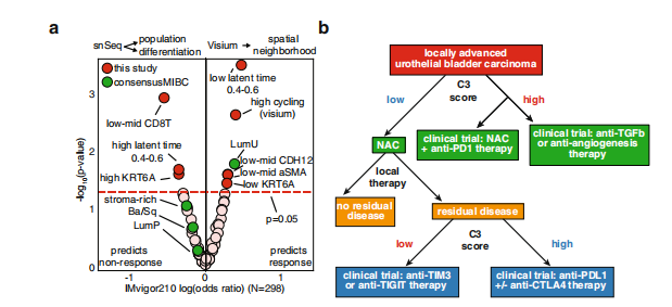 膀胱癌患者接受免疫治療后預后效果的好壞仍然是臨床上面臨的一個主要的挑戰(zhàn)。近期NC一篇文章通過單細轉(zhuǎn)錄組及空間轉(zhuǎn)錄組闡述了對膀胱癌治療具有反應應答的癌細胞群。獲得了在預測對免疫治療的反應方面更優(yōu)的marker基因。有助于為患者的治療提供更理想更優(yōu)的治療方案。