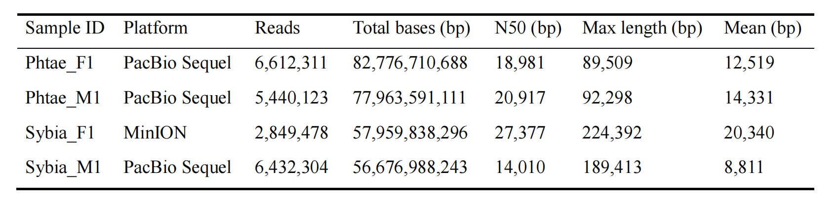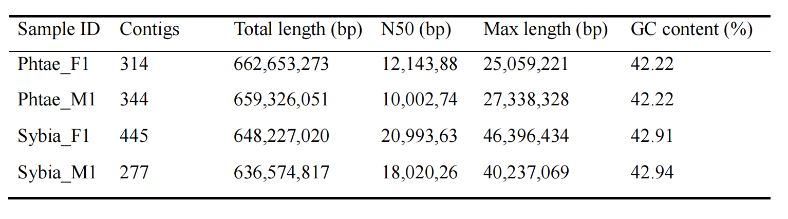 Denovo:雌性、雄性草海龍與雄性綠海龍PacBio平臺;雌性綠海龍Nanopore平臺,雌性、雄性草海龍與雄性綠海龍進(jìn)行Hi-C測序。三代測序技術(shù)對應(yīng)測序數(shù)據(jù)如下表所示: