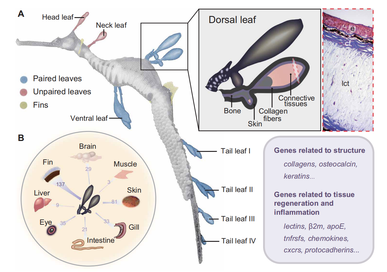 草海龍的頭部、頸部、腹部、背部和尾部區(qū)域有葉子狀的附屬物,可以與周圍環(huán)境相融合,使草海龍以完美擬態(tài)隱匿于海草床中。這些結(jié)構(gòu)是該物種的一種適應(yīng)性進(jìn)化產(chǎn)物,主要由骨基質(zhì)和富含膠原纖維的結(jié)締組織組成。通過轉(zhuǎn)錄組學(xué)分析,發(fā)現(xiàn)其表達(dá)基因(如msx, dlx, fgf)主要從皮膚和鰭等器官募集而來,暗示了相關(guān)基因?qū)π缕鞴佼a(chǎn)生和維持的重要作用。而“附葉”與鰭相比缺乏肢體發(fā)育特異性的hox基因。草海龍的附葉在捕食者的襲擊中經(jīng)常受到損傷,為了研究相關(guān)機(jī)制,作者通過轉(zhuǎn)錄組分析研究發(fā)現(xiàn)在其附葉中炎癥和損傷修復(fù)相關(guān)基因表現(xiàn)出高表達(dá)水平,說明這些基因可能與其附葉的快速愈合和再生能力相關(guān)。同時草海龍?zhí)禺愋詳U(kuò)張的MHC I基因也在附葉中顯著高表達(dá),能為其提供額外的免疫保護(hù)。