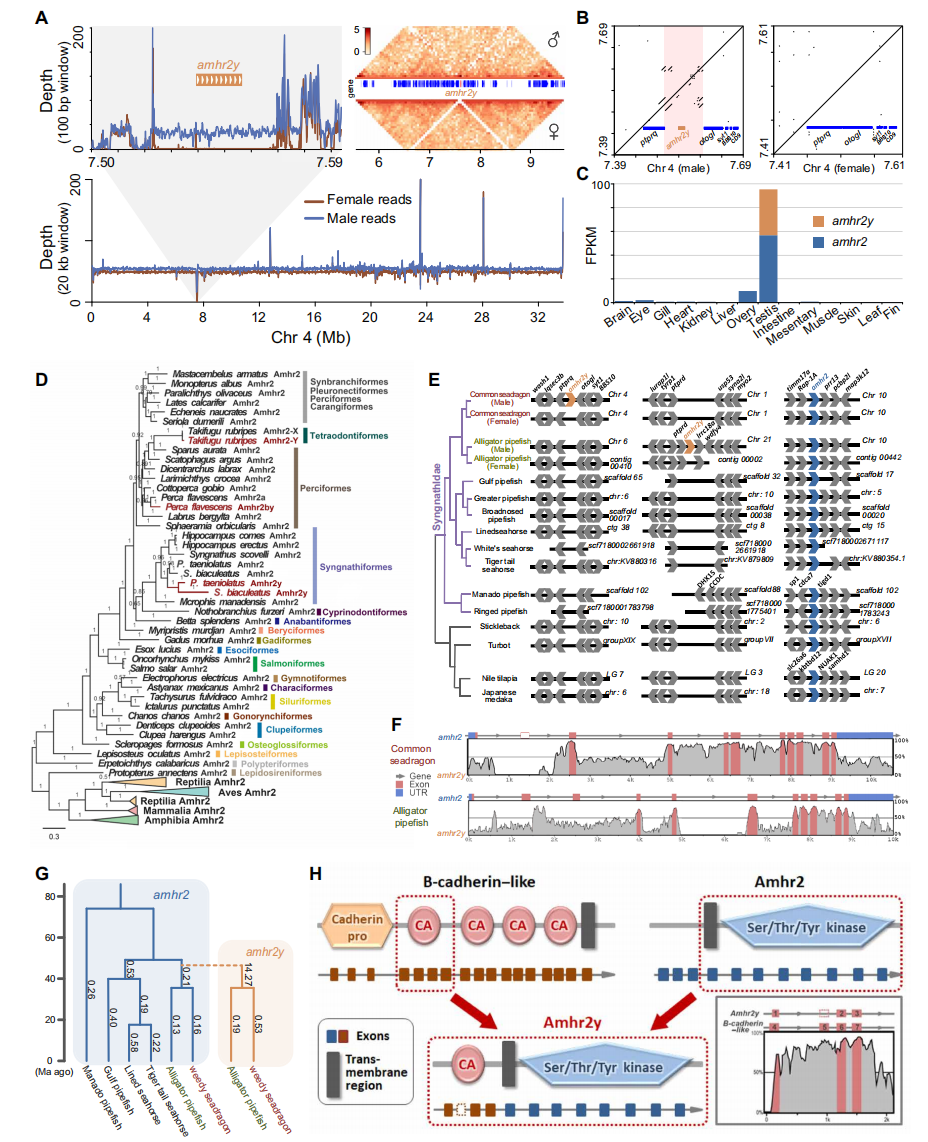 通過雄性和雌性葉海龍Illumina reads正反比對雄性和雌性的全基因組序列,來確定葉海龍中假定的性染色體和性別基因座。結(jié)果顯示Chr4上的一個~47-kb區(qū)域僅在雄性中存在, 且reads覆蓋度為Chr4平均值的一半,該片段經(jīng)Hi-C互作分析結(jié)果支持。注釋及比較分析發(fā)現(xiàn)草海龍和綠海龍的性別決定基因均為amhr2的雄性特異性拷貝amhr2y,但兩者的基因座不相同。系統(tǒng)發(fā)育分析表明,amhr2y起源于它們最近共同祖先的重復(fù)事件,而黃鱸amhr2y是從其譜系中的獨(dú)立重復(fù)事件進(jìn)化而來。研究發(fā)現(xiàn)amhr2y比amhr2受到的選擇壓力更強(qiáng),其整體結(jié)構(gòu)與amhr2相似。
