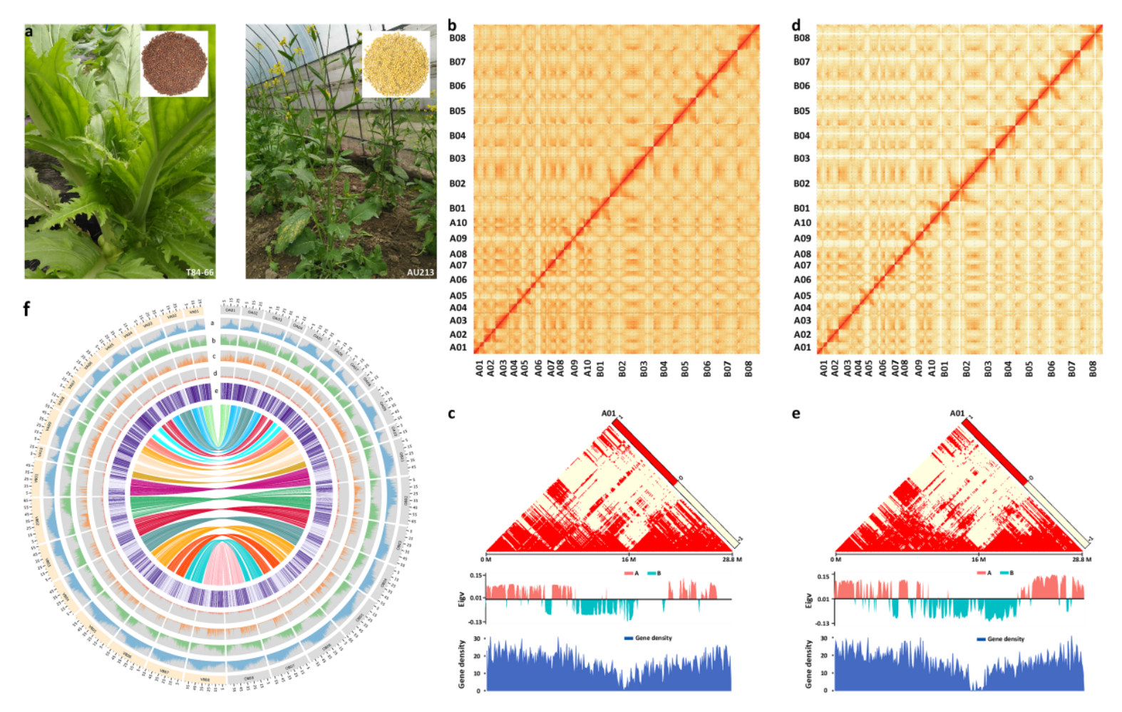 本研究在首次完成榨菜基因組組裝基礎(chǔ)上(Nature Genetics,2016 【項(xiàng)目文章】NG芥菜基因組文章解讀),進(jìn)一步優(yōu)化與解析低硫苷油用芥菜變種AU213的染色體水平基因組。調(diào)研圖評估菜用與油用芥菜大小結(jié)果分別為968 Mb與938 Mb,且contigN50分別為3.36 Mb及4.4 Mb,*大的scaffold近乎跨越了完整的染色體序列。T84-66與AU213基因組BUSCO(97.7 %與98.3%)、CEGMA(99.6 %與99.8 %)、二代數(shù)據(jù)回比(97.12 %與96.18 %)、GOGGs驗(yàn)證以及與前期基因組版本比較等方式,共同表明本次基因組組裝的高完整性。兩種芥菜中分別預(yù)測了100,829及100,048個基因,與16年已發(fā)表的 T84-66 (V1) 版本相比有所增加。芥菜型油菜的Hi-C圖譜顯示常染色質(zhì)(A)和異染色質(zhì)(B)的分布對比顯示,在著絲粒附近的異染色質(zhì)狀態(tài)中具有相對較低的基因表達(dá)模式。