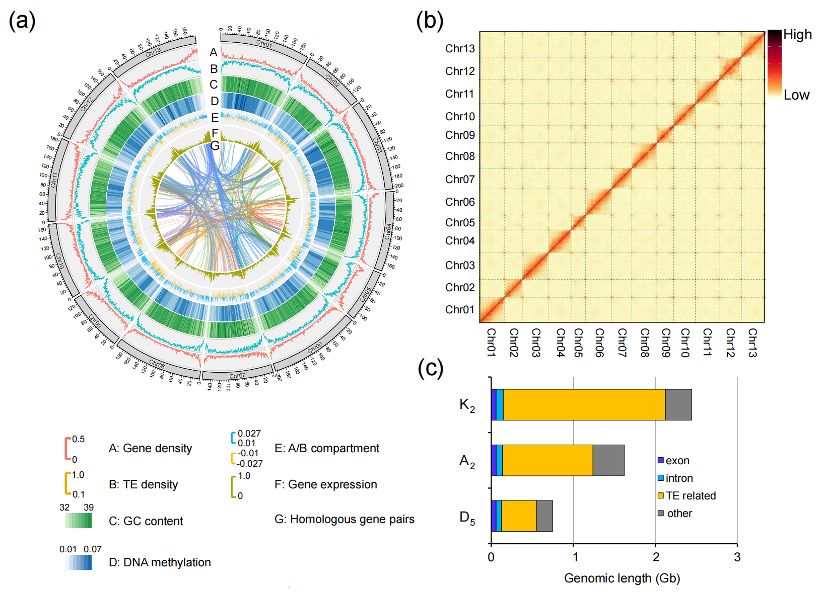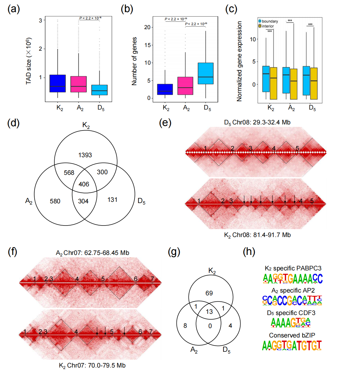 通過HiC染色質(zhì)互作數(shù)據(jù)揭示三個棉種染色體大小的規(guī)律,A2與K2比D5多了約7000個基因,三個基因組中17%的共線性同源基因表現(xiàn)為A/B區(qū)室的染色質(zhì)狀態(tài)改變,這與活躍的轉(zhuǎn)座子擴(kuò)增相關(guān)。