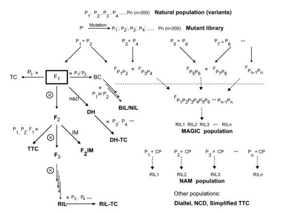 對于動植物群體,通常利用性狀具有顯著差異的兩個親本進行雜交,再通過自交、回交或者其他方式來構建家系群體。家系群體按照遺傳穩(wěn)定性劃分可分為暫時性分離群體和永久性分離群體;如F1、F2、F3、BC等,這類群體中分離單位是個體,一經(jīng)自交或近交,其遺傳組成就會發(fā)生變化,無法永久使用,所以屬于暫時性分離群體;如RIL、DH等,這類群體中分離單位是株系(或者叫株行),不同株系間存在基因型的差異,而株系內個體間的基因型是相同且純合的,自交不分離。這類群體通過自交或近交繁殖后,遺傳組成不會改變,可永久使用,所以屬于永久性分離群體。