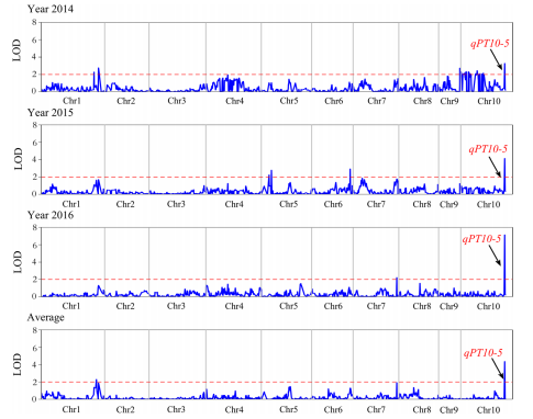 果皮厚度是一個復雜的性狀,是決定甜玉米食用品質的關鍵因素。本研究使用兩個甜玉米品系M03(輪回親本)和M08(供體親本)構建了包含148個品系的甜玉米 BC4F3群體。構建了一個包含3876個SLAF標記的高密度遺傳圖譜,并用于定位果皮厚度的QTL。檢測到14個果皮厚度相關的QTL,并在多年環(huán)境中檢測到一個穩(wěn)定的QTL(qPT10-5),解釋了10號染色體上7.78-35.38%的表型變異。在qPT10-5的目標區(qū)域內發(fā)現(xiàn)了42個候選基因。此外,轉錄組分析顯示,在這42個基因中,有5個基因在兩個親本之間存在差異表達。根據(jù)基因注釋信息,三個基因可能被認為是果皮厚度的候選基因。本研究鑒定了甜玉米薄果皮品種的主要QTL和候選基因,這些結果為進一步的功能研究奠定了基礎。