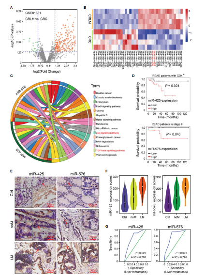 為了驗證這兩種miRNA的差異表達,作者收集了157例CRC患者癌組織及癌旁組織。TMA和ISH試驗顯示,與對照相比miR-425和miR-576在CRC患者中高表達尤其是肝轉移患者(圖1E和F)。ROC曲線計算miR-425和miR-576基于肝轉移及其他相關危險因素線下面積,初步確定其在CRLM中的可信診斷能力(圖1G)。