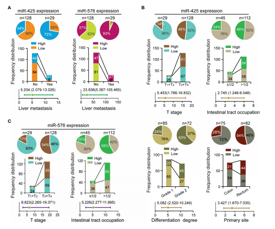 為了探討miR-425和miR-576在CRLM患者中的臨床價值,作者分析了miR-425和miR-576與環(huán)境因素或病理變量包括年齡、性別、家族史、T分期、樣本量、腸道占位、分化、血管浸潤、原發(fā)部位和肝轉移。頻率分布和校正后的回歸分析顯示,miR-425和miR-576高表達均在肝轉移患者組織中頻繁分布(圖2A)。此外,miR-425過表達與CRC患者晚期T期、腸道占位、分化程度和原發(fā)性直腸相關(圖2B)。增加miRNA的表達是滲透到漿膜和廣泛占用腸道的一個促進因素(圖2C)。