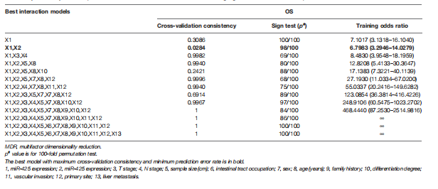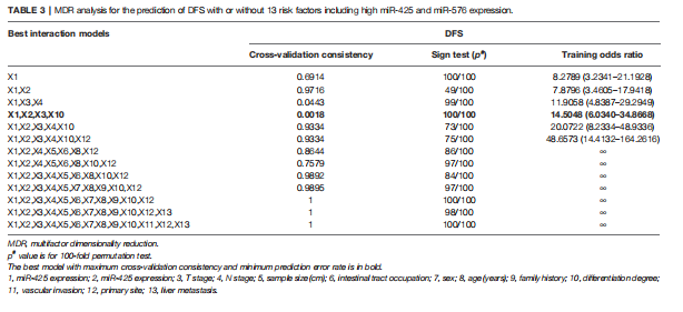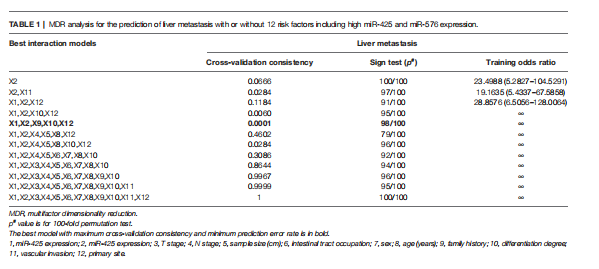 MDR分析顯示,miR-425、miR-576與家族病史、分化程度、原發(fā)部位聯(lián)合使用是評估肝轉移風險的最佳預測模型,其交叉驗證一致性(CVC)最高,預測誤差最?。ū?)。這些結果提示miR-425和miR-576高水平的CRC患者特別容易發(fā)生肝轉移。