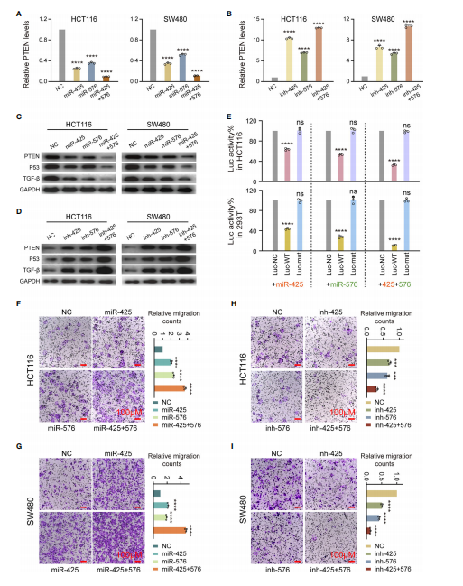接下來,作者證明了miR-425和miR-576通過負調控PTEN-P53/TGF-β軸,在細胞學水平上通過敲低和過表達功能實驗確定了其誘導CRC轉移的發(fā)生。QPCR檢測發(fā)現(xiàn),在HCT116和SW480細胞系中,這兩種miRNA的過表達均導致PTEN mRNA表達明顯抑制(圖5A)。MiR-425和miR-576的缺失顯著增強了PTEN mRNA的表達(圖5B)。WB試驗證實PTEN蛋白的變化一致,P53和TGF-β也是如此(圖5C和D)。正如預期的那樣,結果顯示miR-425和miR-576顯著抑制WT熒光素酶基因表達強度,然而在Mut基因上沒有觀察到明顯的變化表明PTEN 3’UTR與miR-425和miR-576之間存在直接的結合模式(圖5E)。此外miR-425和miR-576的高表達顯著促進了HCT116和SW480細胞的遷移能力分,反之亦然(圖5F-I)。綜上所述,miR-425和miR-576直接靶向PTEN介導的P53/TGF-β信號通路,參與了CRLM過程中細胞遷移的促進。