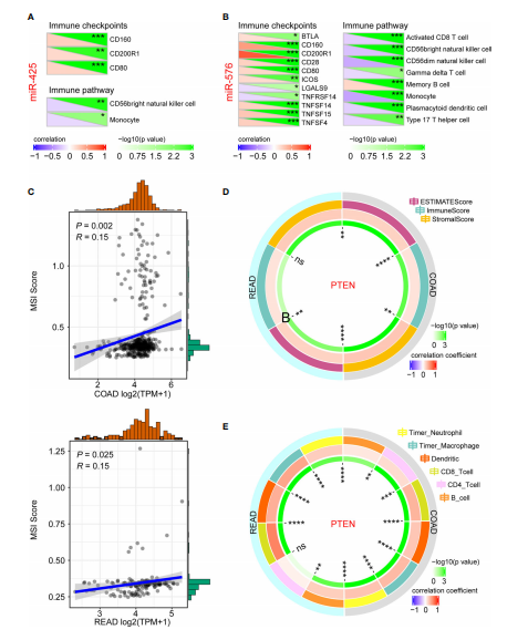 為了進一步研究miR-425和miR-576在CRLM發(fā)生和發(fā)育的免疫調節(jié)中的重要作用,作者首先分析了miR-425和miR-576與相關指標的相關性。因此,miR-425在CRC進展中與免疫檢測點密切相關,如CD160、CD200R1和CD80及免疫通路包括CD65自然殺傷細胞和單核細胞(圖6A)。MiR-425與檢測點和通路存在顯著相關性(圖6B)。此外,作者進一步發(fā)現(xiàn)腫瘤抑制因子PTEN與MSI、TME、免疫細胞浸潤呈正相關,從免疫的角度闡明了PTEN對CRLM的調控作用(圖6C-E)。以上結果表明,miR-425/ miR-576介導的PTEN抑制通過觸發(fā)免疫逃逸促進CRLM過程。