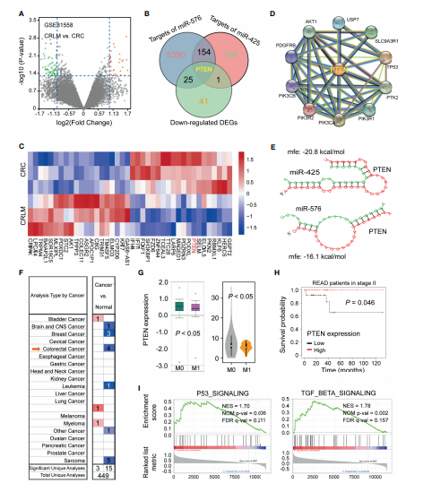 為了闡明miR-425和miR-576介導肝轉移和不良預后的有意義的下游靶點,作者在GSE81558 (n = 6)數(shù)據(jù)集上繪制火山圖,分析CRC組織和癌旁組織之間的DEGs(圖4A)。PTEN是CRLM中顯著下調基因與miR-425和miR-576靶基因的交集(圖4B)。聚類熱圖顯示在CRLM中PTEN的下調最顯著(圖4C)。進一步檢索STRING發(fā)現(xiàn)與PTEN互作的關鍵蛋白(圖4D)。配對序列間的有效MFEs分別為?20.8和?16.1 kcal/mol(圖4E)。進一步分析發(fā)現(xiàn),基于TCGA數(shù)據(jù)庫PTEN在幾種類型的腫瘤中表達顯著下調(圖4F),PTEN表達越低易發(fā)生腫瘤轉移且預后越差(圖4G和H)。此外,基于GSE62321 (n = 26)數(shù)據(jù)集,PTEN與miR-425和miR-576一致,證實PTEN正向參與P53、TGF-β信號通路,在腫瘤轉移中發(fā)揮有意義的作用(圖4I)。這些結果表明,PTEN下調是CRLM中miR-425和miR-576的共同靶點,導致臨床結果不佳。