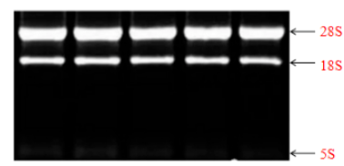 真核生物RNA特有28S、18S、5S三條帶,進(jìn)行瓊脂糖凝膠電泳分析時(shí),28S條帶的亮度大概是18S條帶的兩倍或者以上,且無(wú)拖尾,說(shuō)明RNA的完整性高、未被其他雜質(zhì)污染。若出現(xiàn)其他條帶、或者條帶彌散拖尾,建議重新提取RNA。