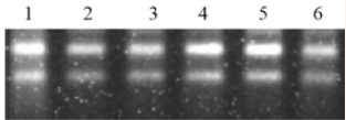 圖3:提取50 mg不同組織中的RNA。Lane 1:番茄果;Lane 2:南瓜葉;Lane 3:玉米根;Lane 4:南瓜莖;Lane 5:絲瓜花;Lane 6:水稻種子。