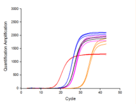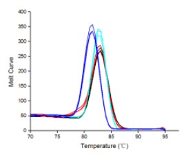 圖7:以1?μg不同物種的RNA為模板(紅色:人肝癌細(xì)胞;藍(lán)色:雞;黑色:斑馬魚(yú);紫色:水稻種子;黃色:番茄果),用BiomarkerScript Ⅱ 1st Strand cDNA Synthesis Kit進(jìn)行逆轉(zhuǎn)錄,得到cDNA產(chǎn)物。再以100 ng不同物種的?cDNA為模板,用Biomarker?2×SYBR Green Fast qPCR Mix進(jìn)行qPCR擴(kuò)增。
