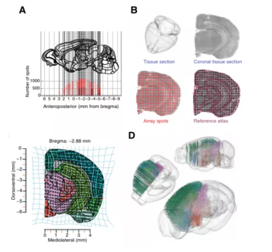 通過使用全腦空間轉(zhuǎn)錄組學(xué)基于對空間定義特征的無偏識別來生成成年小鼠大腦的系統(tǒng)分類。研究發(fā)現(xiàn)分子信息足以推斷大腦的復(fù)雜而詳細(xì)的神經(jīng)解剖組織結(jié)構(gòu)。無監(jiān)督分類顯示了特定于區(qū)域和層的子區(qū)域,在等皮層和海馬體以及紋狀體的新亞區(qū)。分子圖譜進(jìn)一步支持了從單細(xì)胞RNA圖譜中表征神經(jīng)元的空間特性,并提供了使用最小基因集(大腦調(diào)色板)為大腦添加注釋的資源??傊?,本研究建立了一個(gè)分子圖譜來正式定義大腦區(qū)域的空間組織,包括用于映射和靶向離散神經(jīng)解剖結(jié)構(gòu)域的分子代碼,通過空間維度直觀詮釋了大腦組織不同空間區(qū)域特征,為剖析大腦組織提供了全面的時(shí)空圖譜。