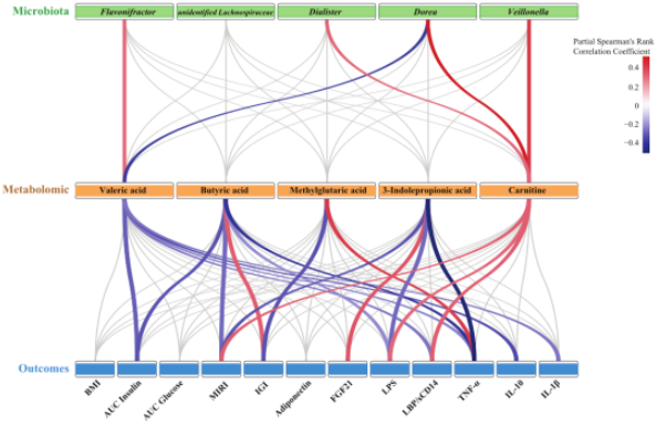圖3.腸道菌群、共代謝物和葡萄糖穩(wěn)態(tài)、腸道健康和炎癥的生物標志物之間的相關(guān)性分析。